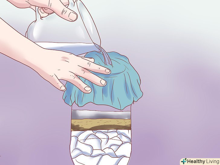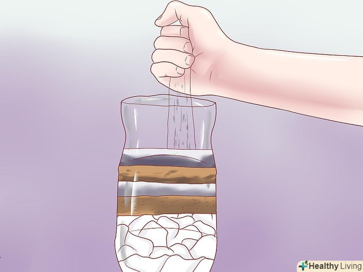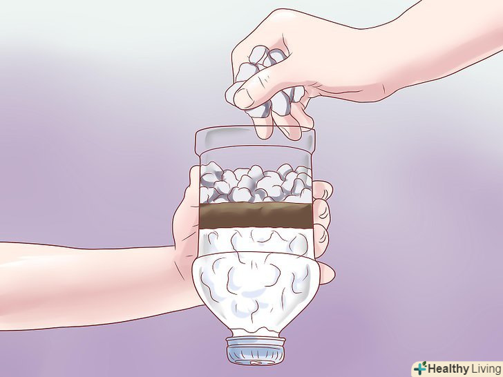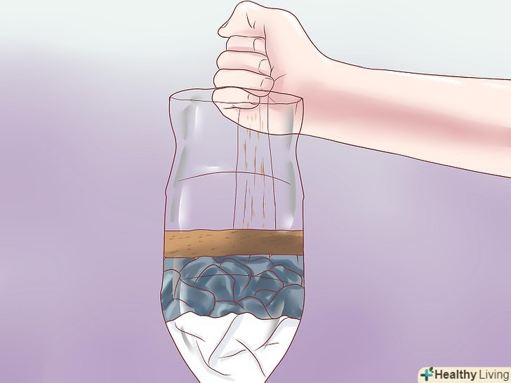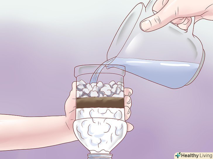 Викладайте шари вашого фільтра, щоб відсіяти різні частинки. ви повинні скомпонувати шари фільтра так, щоб спочатку йшли великі шматки, потім менше і в кінці найменші.- Прикладом правильно розкладених шарів фільтра можна вважати гравій або камені на самому верху, потім шар піску і деревного вугілля, а в самому низу бавовняна тканина або фільтри для кави, які зможуть вловити найдрібніші частинки.