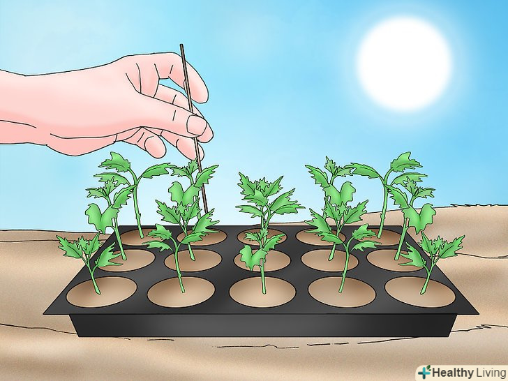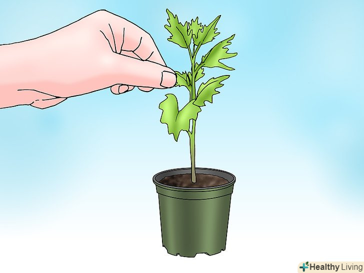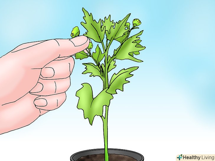 Стисніть молоді хризантеми для заохочення зростання нових. після того, як Ваші паростки приймуться і виростуть в молоді рослини (зазвичай в кінці весни), хороша практика – затиснути їх, прискоривши утворення нових стебел, це призводить до пишного зростання і більшої кількості квітів.- Традиційно це робиться 1 червня, але можна і в будь-який час на початку літа, після того, як рослина вже має трохи більше шести листя на стеблі. Рахуйте Нижні 6-листові стебла на головному стовбурі рослини.