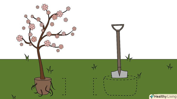 Викопайте яму відповідної глибини, але ширше кореневої грудки дерева. Перед посадкою потрібно оглянути кореневу систему яблуні. За допомогою лопати викопайте на обраній території яму відповідної глибини, але в два-три рази ширше кореневого кома. [12]- Розташуйте дерево в ямі. Верхня частина шийки кореня повинна знаходитися на одній рівні або трохи вище рівня землі.
