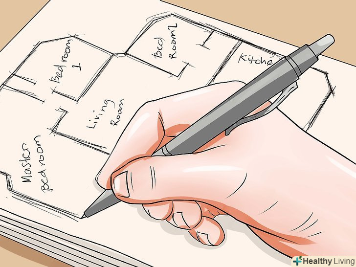 Накидайте поверховий план. це допоможе вам перевести ідеї з концепції в практичну площину. В якості дуже простого прикладу, уявімо, що вам треба 3 спальні, 2 ванни, відкриту кухню і «велику кімнату» як їдальню і для розваг.- Почніть з визначення основних зон. Наприклад, на правій стороні будинку, 2 спальні, які виходять на одну сторону холу, з приєднаною ванною , і 3 спальня на іншій стороні, з ванною господаря. В середині вхід, що відкривається у велику кімнату. А на лівій стороні кухня, пральня, вхід в гараж. Може бути ви знайдете цей процес більш забавним і гнучким, якщо виріжете кімнати з паперу і будете рухати їх до тих пір поки не знайдете розташування, яке вас влаштує.