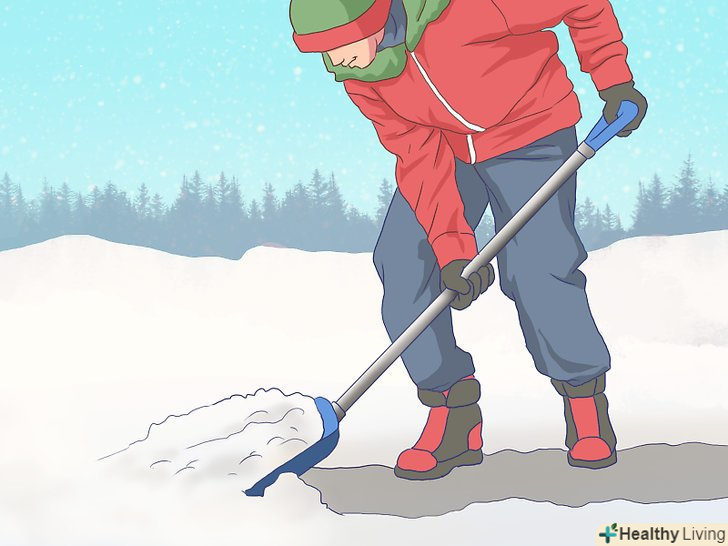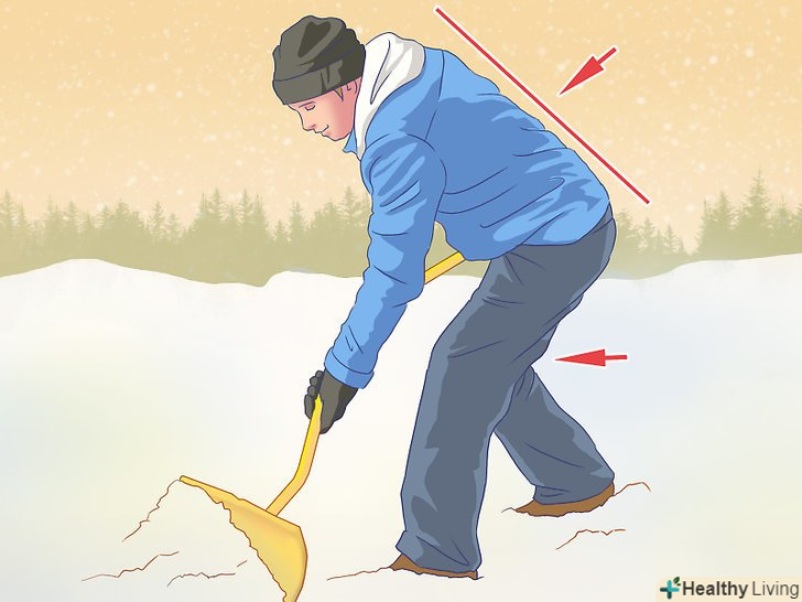 Правильно поводьтеся з лопатою, щоб не травмуватися. прибираючи сніг лопатою, легко можна перевантажити спину або коліна. Проте такі наслідки можна запобігти. Дуже важливо не навантажувати лопату більше необхідного. Працюйте з посильними для вас обсягами снігу. По можливості більше концентруйтеся на тому, щоб відсунути сніг, а не перенести його, і не забувайте робити регулярні перерви в роботі. [2]- Коли вам необхідно підняти лопату зі снігом, сідайте і піднімайте її силою ніг. Тримайте спину прямо. Чи не нахиляйтеся і не перенапружуйте поперек — так ви захистите спину від травм. [3]