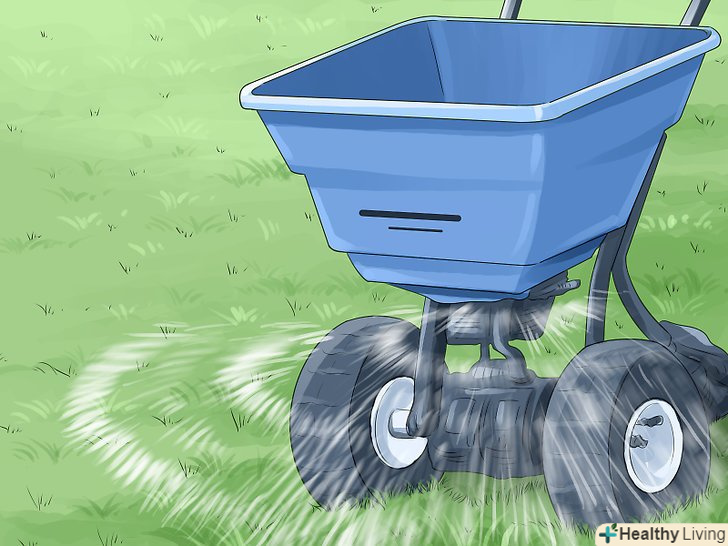 Використовуйте розкидач добрив. важливо рівномірно розподіляти добриво по газону для однакового кольору дерну, а також не виходити за межі газону. Якщо випадково удобрити клумби або грядки, то можна пошкодити рослини. Потрапляючи в водостічні канави або Системи водопостачання, добриво представляє екологічну загрозу. Існує два основних види розкидачів: [29]- Сівалки забезпечують високу точність, розподіляючи меншу кількість добрива за межами газону. Встановіть половину потужності і обробляйте газон в два проходи під кутом 90º, щоб мінімізувати "смугування".