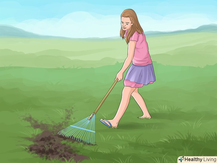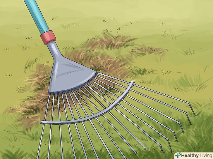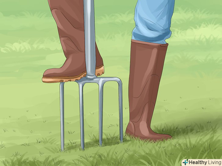 Аеруйте газон один-два рази на рік. візьміть напрокат аератор для газону, щоб виконати в газоні отвори або надрізи і поліпшити аерацію і дренаж галявини. Для прибудинкового газону досить проводити аерацію восени. При аерації грунт повинен бути м'яким, але досить сухим, щоб земля не утрамбувалася. [30] в ідеалі аератор повинен проробляти отвори в грунті глибиною 5-7,5 сантиметрів і діаметром 1.25-2 сантиметри. Виконайте один або два проходи, щоб отримати близько ста отворів на квадратний метр. [31]- Витягнутий грунт з дерном слід залишити на газоні. Якщо рослинність занадто довго розкладається, то розбийте грунт граблями або зберіть в компост. [32]