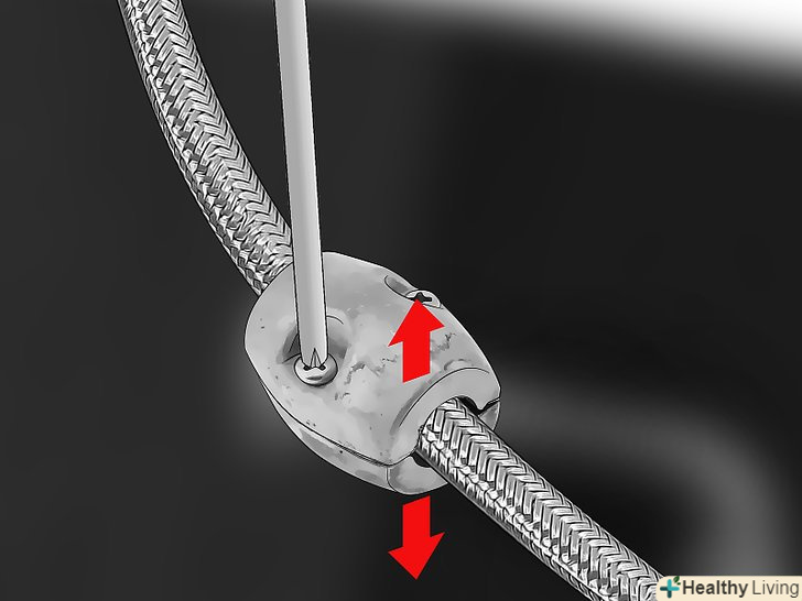 Зніміть грузик зі шланга. у всіх змішувачах з висувним виливом використовується грузик, щоб шланг опускався вниз під додатковою вагою. Вкажіть на шлангу місце кріплення грузика, щоб потім встановити його на місце. Спочатку потрібно зняти грузик, щоб зняти шланг.- Грузик може ковзати по шлангу або замикатися. В інших випадку відкрутіть всі гвинти, які утримують дві половинки грузика, а потім зніміть деталь зі шланга.