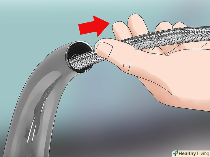 Прикріпіть шланг до змішувача. візьміть новий шланг і підключіть його змішувача в тій же точці, де був підключений Старий шланг. [8] руками повертайте гайку вправо (за годинниковою стрілкою), щоб затягнути. Не перекручуйте шланг!- Затягніть гайку вручну наскільки можливо, а потім проверніть її ключем для раковин ще на чверть обороту. Не перетягуйте гайку, щоб не пошкодити різьблення.