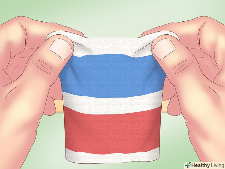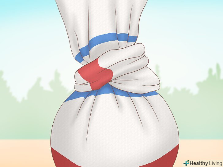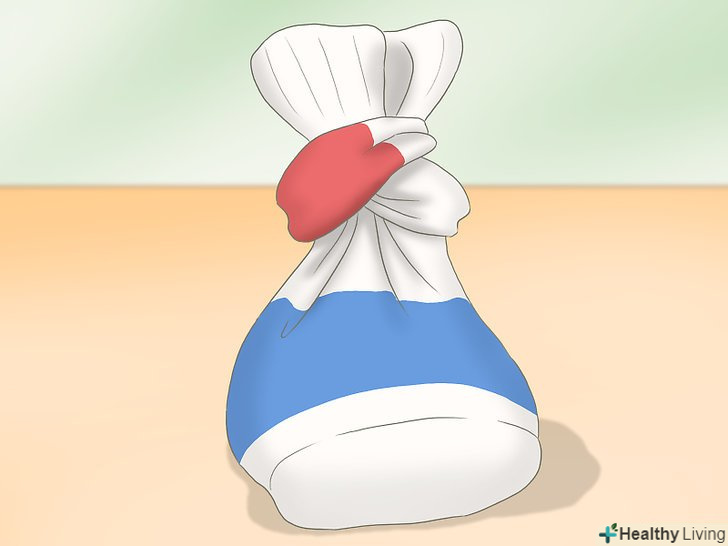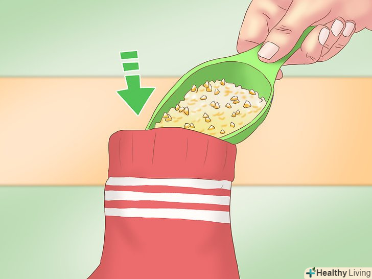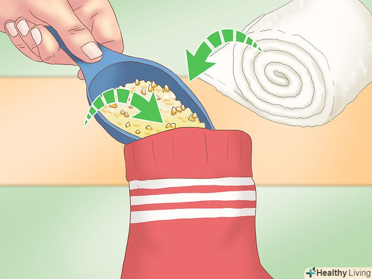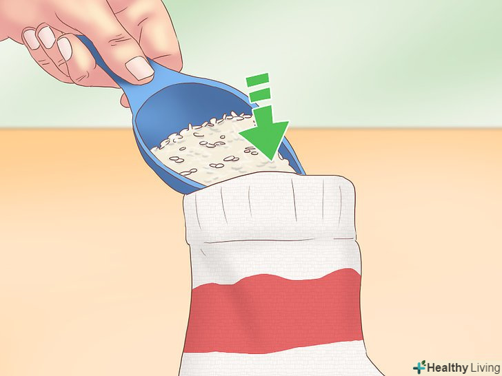 Насипте рис в носок. щоб зробити розслабляючий мішечок, використовуйте довгі шкарпетки без дірок. Візьміть чотири склянки білого рису або подібного продукту, наприклад, кукурудзяні зерна або насіння льону, і насипте в носок. [2]- Використовуйте таку кількість наповнювача для вашого носка, яке вам необхідно. Якщо ви хочете, щоб у вас вийшов більш м'який мішечок, насипте невелику кількість обраного наповнювача. Такий мішечок можна використовувати для розслаблення невеликих ділянок тіла.