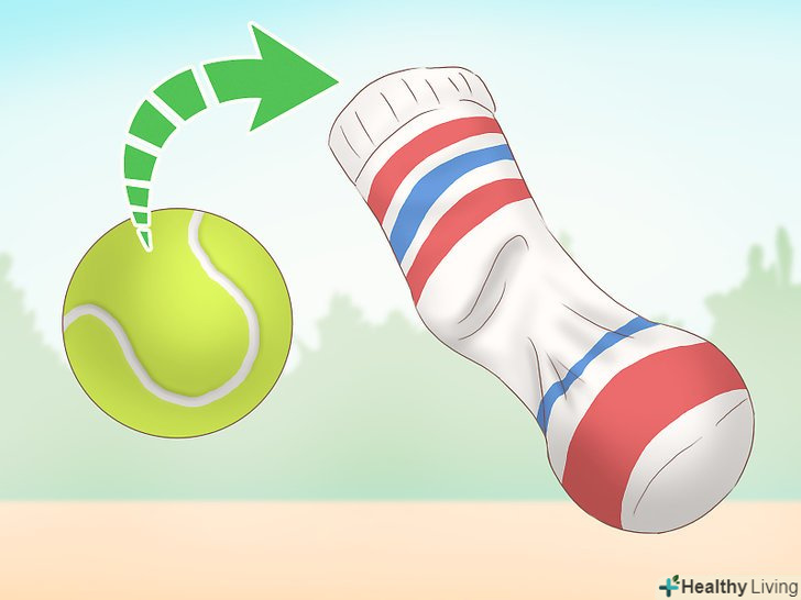 Покладіть тенісний м'ячик в носок. він повинен знаходитися там, де зазвичай розташовуються Пальці в шкарпетці. Замість м'яча можна використовувати ласощі для собак або порожню пластикову пляшку з водою. Собака буде грати цими предметами. Завдяки тому, що іграшка буде в шкарпетці, вона прослужить набагато довше, ніж магазинні іграшки. [10]