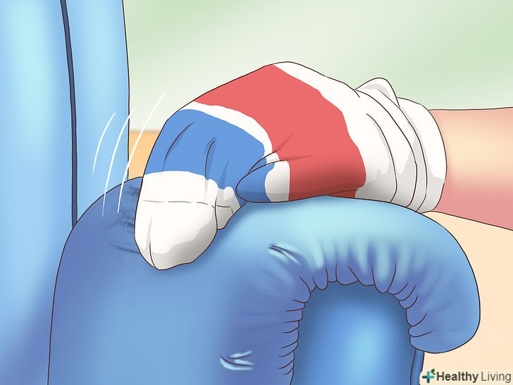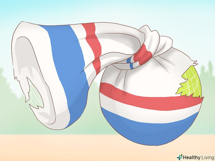 Зав'яжіть вузол зверху над м'ячем. оберніть носок таким чином, щоб у вас вийшов вузол. Зав'яжіть вузол вище м'яча. Завдяки цьому собаці буде легше дістати предмет з носка. Крім того, вона не згризе кінці носка відразу ж, як отримає нову іграшку.- Якщо ви хочете, щоб собака відразу ж дістала предмет, наприклад, улюблені ласощі, не зав'язуйте носок. Сформуйте з носка куля і закріпіть його за допомогою вузла.