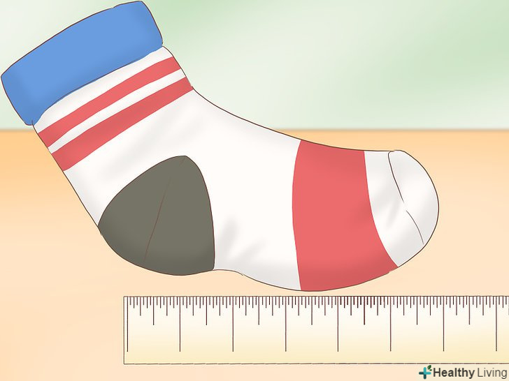 Відміряйте таку довжину носка, яка вам необхідна. якщо ви хочете зробити чохол для термоса або для пляшечки, виміряйте висоту пляшечки. Однак не варто вимірювати всю пляшечку, досить виміряти тільки ту частину, на яку ви збираєтеся надягати чохол. Додайте до вимірювань 2,5 см.робіть виміри на носку, починаючи з точки, де розташовується великий палець. [4]- Якщо ви хочете, щоб чохол був трохи призібраний, додайте кілька додаткових сантиметрів на тканини.