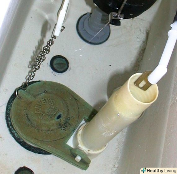 Очистіть або замініть заслінку і/або клапан змиву. якщо бачок перестає наповнюватися, а потім вода знову починає переривчасто надходити або вода постійно витікає в унітаз, то ви маєте справу зі слабкою витоком з бачка в унітаз. Додайте в бачок фарбувальну таблетку або кілька крапель харчового барвника. Можливо, у вашому господарському магазині є безкоштовні фарбувальні таблетки на цей випадок. Якщо через пару годин без змивання ви виявите сліди фарби в унітазі, то це буде свідчити про слабку витоку – з бачка в унітаз випливає невелика кількість води.- Найпоширенішою причиною такої проблеми виступає протікає заслінка. З часом ця недорога гумова деталь схильна до руйнування, вона може стати нееластичною і вимагати заміни. Також можливе відкладення мінералів на самій заслінці і / або на обідку змивного клапана.