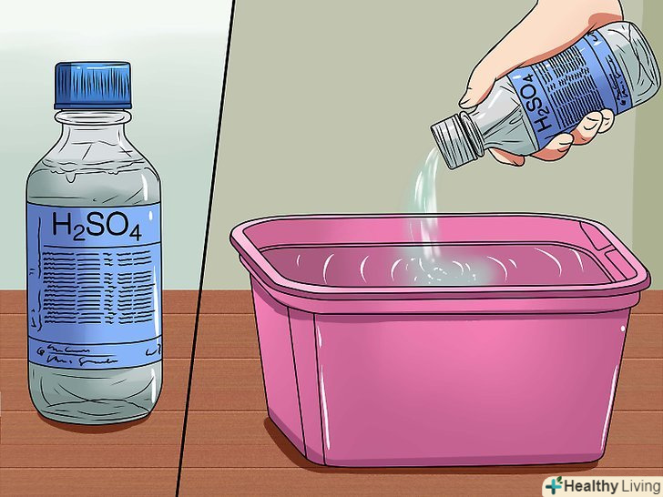 Приготуйте розчин сірчаної кислоти.- Додайте сірчану кислоту до дистильованої води в пластмасовому контейнері в співвідношенні 5 частин води на 1 частину кислоти.