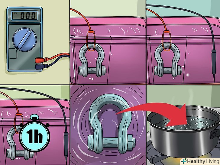 - Занурте катод або позитивний кабель у розчин, не торкаючись анода або алюмінієвого об'єкта.