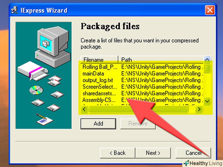 Тепер виберіть файли, які ви хочете додати в інсталятор.для цього натисніть "Додати". Якщо ви хочете видалити доданий файл, виділіть його і натисніть "Видалити". Потім натисніть "Далі".- Тепер задайте параметри вікна інсталятора.
