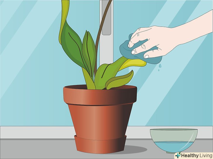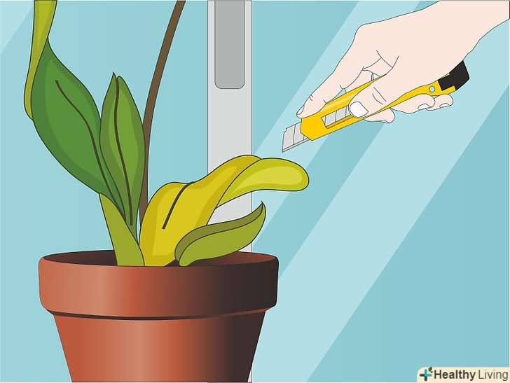 Видаляйте хворі тканини. якщо ви помітили, що листя орхідеї змінили колір або на них з'явилися плями (світло-жовті, жовті, коричневі або чорні), то дуже ймовірно, що рослина страждає від якогось захворювання. Насамперед слід видалити максимально можливу кількість уражених тканин. Скористайтеся стерильним інструментом і зріжте всі хворі листя, квітконоси і квіти. Обов'язково продезінфікуйте використовуваний інструмент як до обрізки хворих тканин, так і після неї. [16]- У деяких випадках розумніше позбутися від хворого рослини цілком, щоб захворювання не поширилося.
