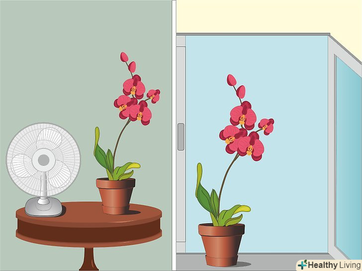 Забезпечте легку циркуляцію повітря. Так як орхідеї не ростуть в справжньому грунті, їх коріння для здоров'я необхідна циркуляція повітря. У теплу пору року можна відкривати вікна для легкого провітрювання. В інший час можна включати в кімнаті стельовий вентилятор на низькій швидкості або звичайний обертається вентилятор, спрямований у зворотний від орхідей сторону, щоб повітря не застоювався. [5]