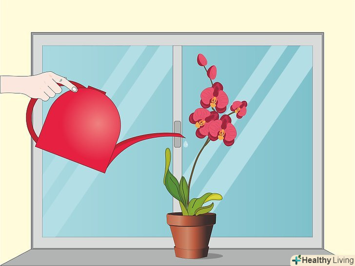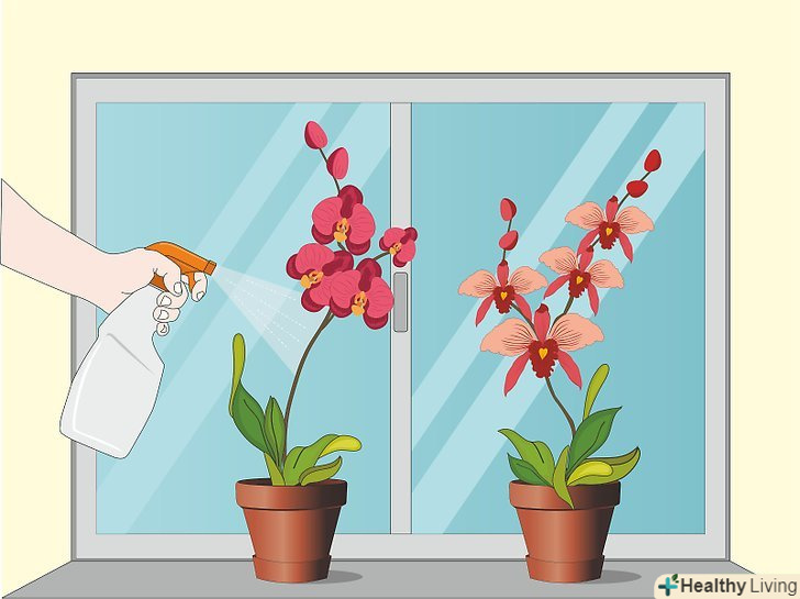 Щодня обприскуйте орхідеї водою, якщо рівень вологості в приміщенні нижче 40 %. орхідеї найкраще себе почувають при вологості 40-60 %. [7] придбайте гігрометр в садовому магазині або великому супермаркеті і використовуйте цей прилад, щоб перевіряти рівень вологості у себе вдома. Якщо вологість буде опускатися нижче 40 %, один раз в день обприскуйте орхідеї водою з пульверизатора з дрібним розпилювачем. [8]- Якщо вологість буде вище 60 %, включайте систему осушення повітря в тій кімнаті, де знаходяться орхідеї, щоб запобігти зростанню бактерій і грибків.