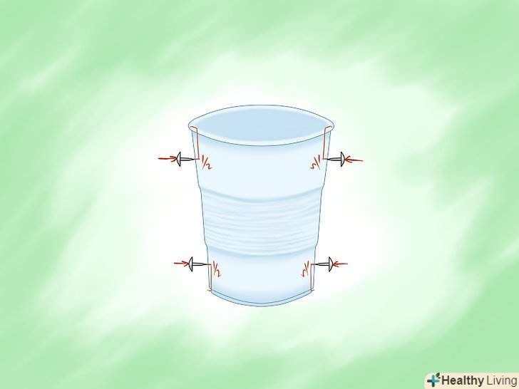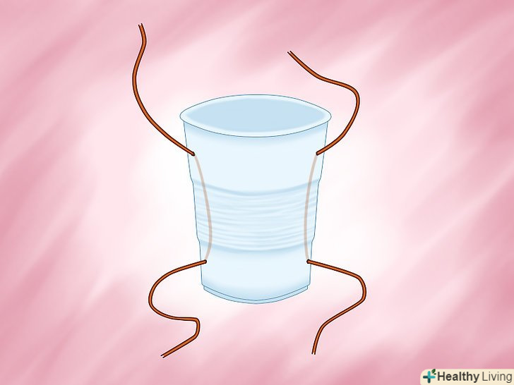 Починайте робити підставу. проткніть кнопкою чотири дірки в пластиковому стакані. Одну дірку зробіть на відстані 1 сантиметр від його верхнього краю, а іншу – на відстані 1 сантиметр від дна, а потім зробіть те ж для протилежного боку. Якщо у вас немає пластикового склянки, підійде також стакан з пінопласту.
