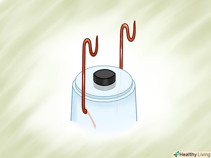 Зробіть струмопідводи для батареї. відріжте два шматки жорсткої дроту довжиною втричі більше висоти склянки і протягніть їх в дірки, виконані в ньому.