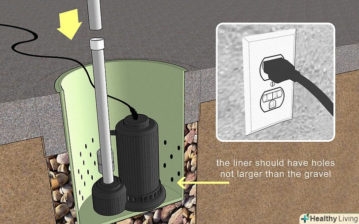 Встановіть насос. помістіть насос в дренажну гільзу, підключіть до нього кінцеву секцію зібраної труби, і включіть насос в розетку.- Можливо що вам доведеться просвердлити в гільзі насоса багато отворів, для того щоб вода могла в неї проникнути. Діаметр цих отворів повинен бути менше розміру гравію, щоб гравій не міг провалюватися крізь них.