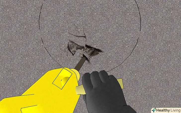 Зніміть бетонне покриття. це досить швидка робота, якщо вам вдасться взяти напрокат електричний відбійний молоток. Намагайтеся не подрібнювати бетон, а замість цього розбивайте його на зручні для видалення шматки. Коли ви наріжете бетон шматками, подденьте їх відбійним молотком і приберіть.- В якості альтернативи відбійного молотка ви можете використовувати ударну дриль (перфоратор) зі свердлом для бетону, кувалду і зубило для бетону. Вставте в дриль найбільше свердло, наробіть отворів в бетоні через кожні 10 сантиметрів по зовнішньому периметру вирізається діри, а потім розколіть бетон між отворами за допомогою кувалди і зубила.