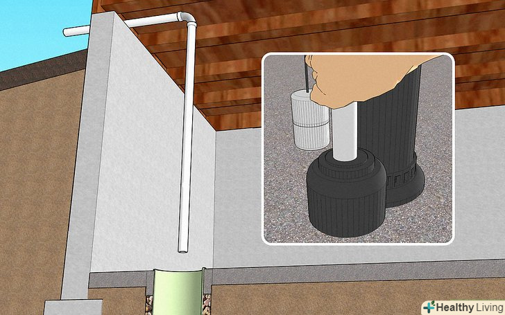 Зберіть відвідну трубу з ПВХ, аж до її виведення назовні через торцеву балку. у більшості насосів використовується 1,5 дюймова труба, Однак рекомендується прочитати інструкцію, що додається до насоса, щоб переконатися, що у вас є відповідна труба. Зовні будинку залиште невеликий відрізок труби, так як на іншій відстані можна буде використовувати гнучкий шланг.- При складанні труби не забудьте приміряти посадку всіх секцій, перед тим як починати їх склеювати. Працюйте в добре провітрюваному приміщенні, щоб уникнути отруєння парами розчинника. Наносите клей як на внутрішню, так і на зовнішню сторони поверхонь, що склеюються. Вибір конкретних вузлів для складання Труби залежить від пристрою вашого будинку і фундаменту, тому ця частина роботи повинна виконуватися досить досвідченим сантехніком. [3]
