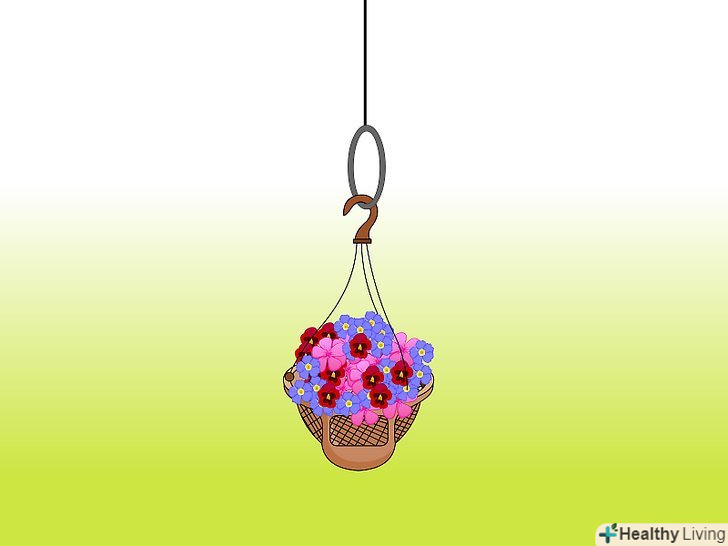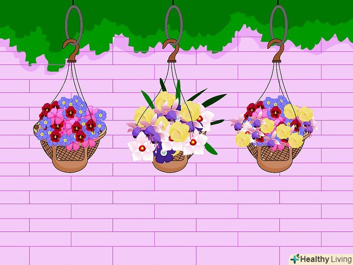 Повісьте кошик у сприятливому місці. розміщення ваших підвісних кошиків залежить більшою мірою від ваших особистих переваг. Можливо, ви захочете заховати те, що не так красиво, як вам би хотілося, можливо, ви хочете прикрасити свій сад або квартиру або ж ви просто хочете похвалитися квітами, які ви любите. Враховуйте також потреби своїх рослин; мало хто Рослини можуть витримувати повне сонячне світло або повну тінь при висаджуванні їх в підвісних кошиках.