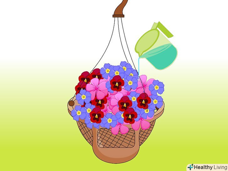 Тримайте вологими. залежно від температури навколишнього середовища і від виду рослин, підвісні кошики іноді потрібно поливати кожен день. Використовуючи лійку з довгим носиком, ви зможете поливати рослину дуже ефективно, дістаючи до найвищих підвісних кошиків.