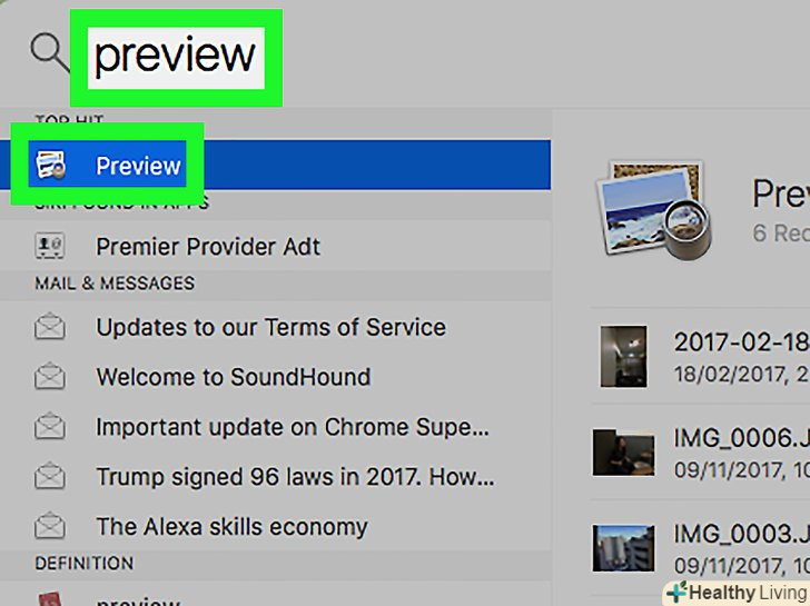 Запустіть програму "перегляд". натисніть на значок у вигляді лупи над декількома фотографіями в доці.- Якщо цього значка в доці ні, введітьперегляд у Spotlight , а потім двічі клацніть по «Перегляд» в результатах пошуку.