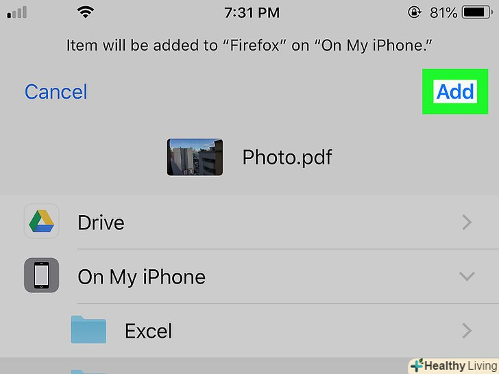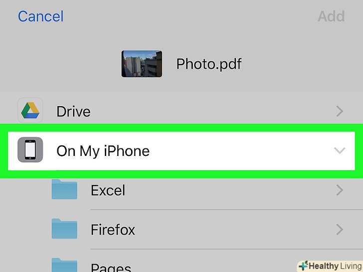 Виберіть сховище для PDF-файлу.натисніть на папку, в якій ви хочете зберегти PDF-файл.- Якщо натиснути "на iPhone", можна вибрати папку на своєму iPhone.