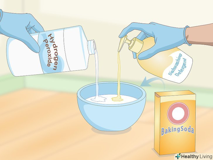 Змішайте перекис водню, засіб для миття посуду і харчову соду. змішайте в пластиковій мисці 1½ столової ложки (22 мілілітри) перекису водню, 1 столову ложку (15 мілілітрів) рідкого миючого засобу для посуду і 2 столові ложки (40 грамів) харчової соди. При реакції компонентів почнуть виділятися бульбашки газу, і у вас вийде густа паста. Як слід перемішайте інгредієнти, щоб вийшла однорідна маса. [6]- Перекис водню найкраще підходить для світлих килимів. Якщо ви хочете почистити Темний килим, попередньо перевірте суміш на невеликій ділянці і подивіться, чи не змінює вона колір килима.