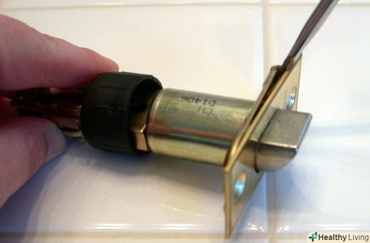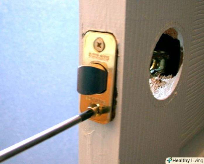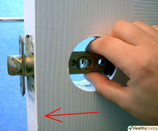 Втягніть новий замок і лицьову панель всередину дверей. переконайтеся, що замок стоїть у напрямку закриття дверей, так що Похила сторона повинна увійти в паз в стіні. Спробуйте проштовхнути його руками. Якщо не спрацювало - вам буде потрібно просвердлити отвір побільше. В якості альтернативи ви можете помістити невеликий дерев'яний брусок навпроти лицьової пластини і трохи попрацювати молотком. Пластиковий чорний манжет показаний на фото допоможе прибрати зайві міліметри діаметра, якщо отвір занадто велике
