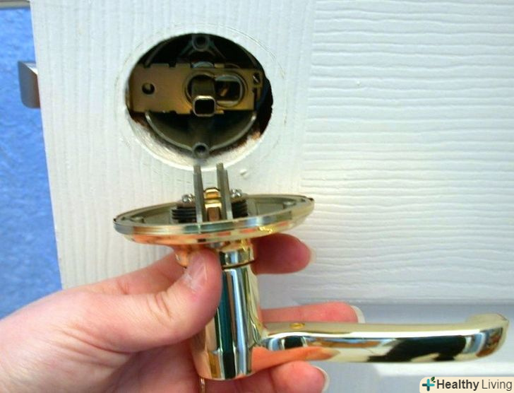 Вставте ручки в двері так, щоб квадратний кілочок проходив в квадратний отвір і отвори для гвинтів поєдналися з їх різьбленням з іншого боку. Ручки і замок повинні дивитися в правильному напрямку.