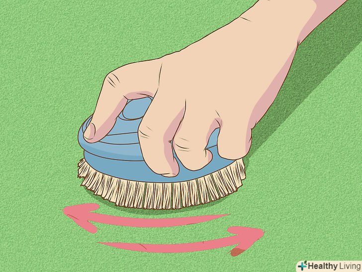 Почистіть килим щіткою. Використовуйте щітку для килима з жорсткою щетиною, щоб вимити ділянку, на яку ви нанесли миючий засіб. Завдяки цьому миючий засіб просочить волокна, що знаходяться в глибині килима і вам вдасться видалити бруд повністю. [10]- Після того, як ви почистите килим щіткою, почекайте близько 30 хвилин, щоб він висох.