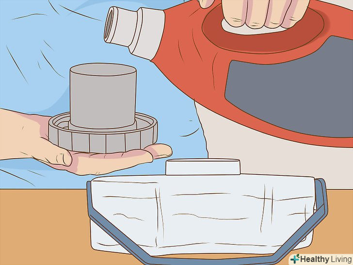 Налийте в резервуар рідкий засіб для чищення килимів. в апараті для чищення килимів є резервуар, куди необхідно налити обраний засіб для чищення. Заповніть резервуар рідким засобом, який ви зробили. Якщо резервуар оснащений ковпачком або кришкою, не забудьте помістити її на місце.- Деякі апарати оснащені резервуарами для чистої води і миючого засобу. Заповніть резервуари відповідними рідинами. [13]