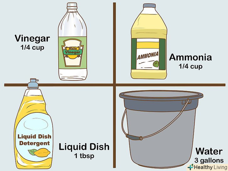 Приготуйте засіб для чищення килимів на основі аміаку. засоби на основі аміаку набагато ефективніше звичайних засобів. Однак, застосовуючи даний засіб, слід дотримуватися запобіжних заходів, тому що аміак є агресивною речовиною, яка може завдати шкоди шкірі, очам, дихальних шляхах. Також зверніть увагу на те, що аміак може пошкодити деякі матеріали. Одягніть рукавички і змішайте наступні інгредієнти: [4]- 1 столова ложка (15 мл) засоби для миття посуду;