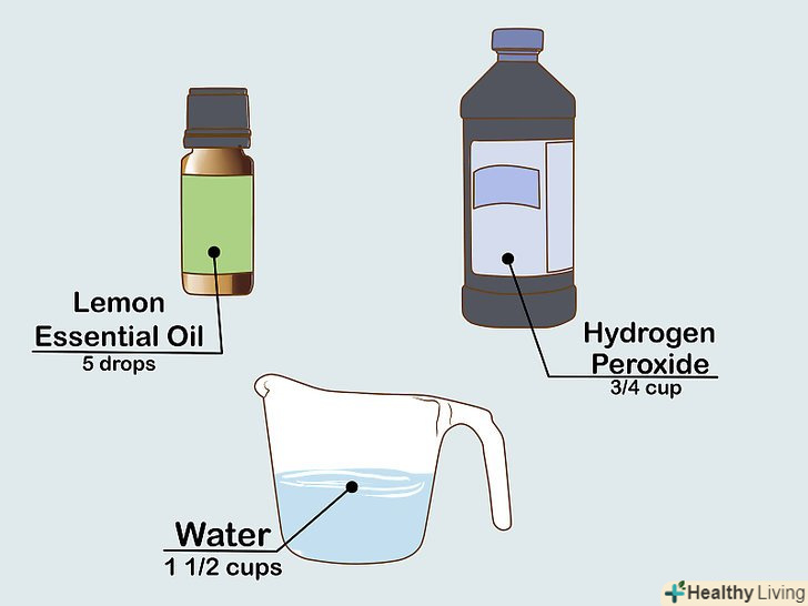 Приготуйте засіб для чищення килимів на основі перекису водню і лимона. перекис водню є ефективним очищувачем, а лимон-відмінним засобом для видалення жиру і неприємного запаху. Об'єднавши перекис водню з лимоном, можна отримати хороший засіб для чищення килимів. Щоб приготувати даний засіб: [5]- Налийте ¾ склянки (175 мл) перекису водню;