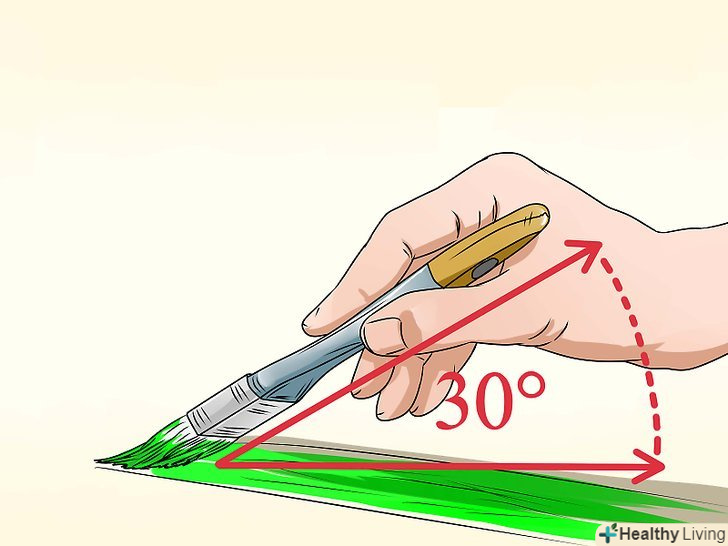 Відразу після нанесення фарби першим рухом, нахиліть кисть під кутом так, щоб тільки кінчики щетини торкалися робочої поверхні. під кутом приблизно 30 градусів до початкового мазка, проведіть кінчиками кисті назад уздовж фарбується області. Це називається згладжуванням фарби.- Відразу після нанесення фарби кінчиками кисті по діагоналі, поверніть кисть в початкове положення. Все ще використовуючи тільки кінчики ворсинок, повторити перший мазок, який ви зробили. Ці 3 кроки, якщо їх дотримуватися, повинні допомогти отримати гладку поверхню без видимих мазків.