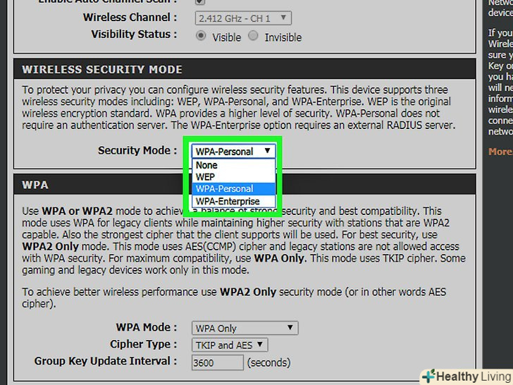 Налаштуйте бездротову мережу.у більшості роутерів розділ Налаштування бездротової мережі знаходиться в основному меню. Там ви можете включити або вимкнути бездротову мережу, змінити її назву і вибрати тип шифрування.- У полі SSID введіть назву мережі. Ця назва буде відображатися на будь-якому пристрої, що виявив вашу мережу. Якщо ви живете в густонаселеному районі, не використовуйте в якості імені Мережі свої персональні дані, так як будь-яка людина з пристроєм бездротового зв'язку дізнається їх.