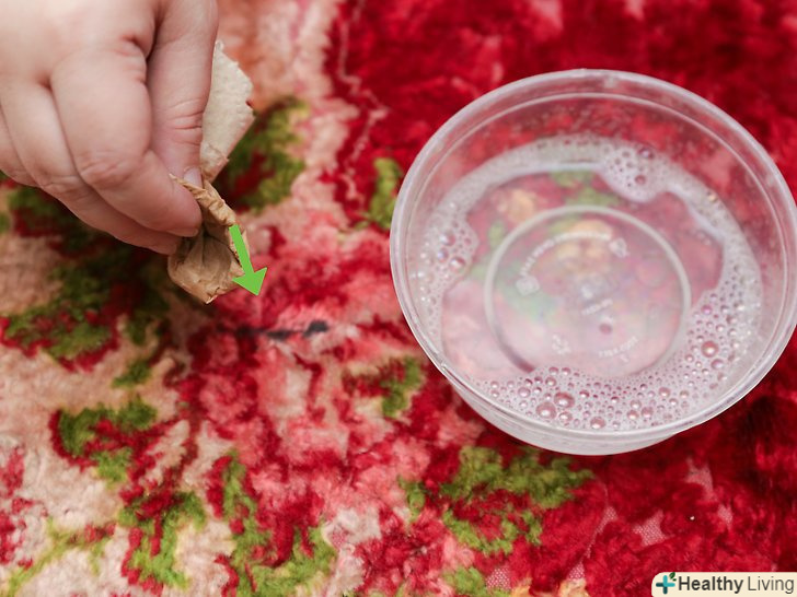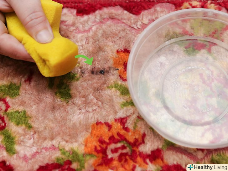 Нанесіть розчин на пляму. можна використовувати тканинну серветку, паперовий рушник або губку. Бажано використовувати білу тканинну серветку або губку, щоб при видаленні плями килим не поміняв колір. Промокніть пляму. Не тріть його, так як ви можете розтерти пляму ще більше. Крім того, підводка для очей може глибше проникнути в волокна килима. [2]- Добре просочіть пляму готовим розчином.