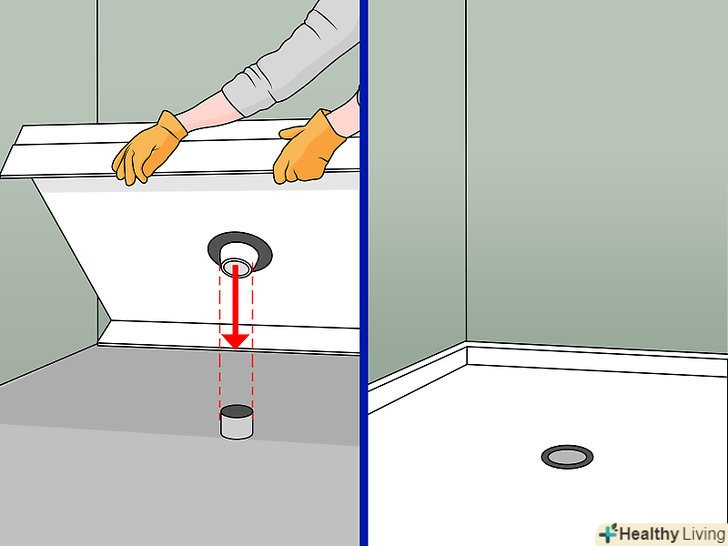 Розташуйте піддон в необхідному місці на підлозі. Побудуйте отвір для зливу на піддоні з отвором в підлозі. Не використовуйте клей або кріплення, просто вишикуйте його правильно і переконайтеся, що піддон щільно прилягає. Також, переконайтеся, що отвори збудовані відповідно до водостічної трубою.