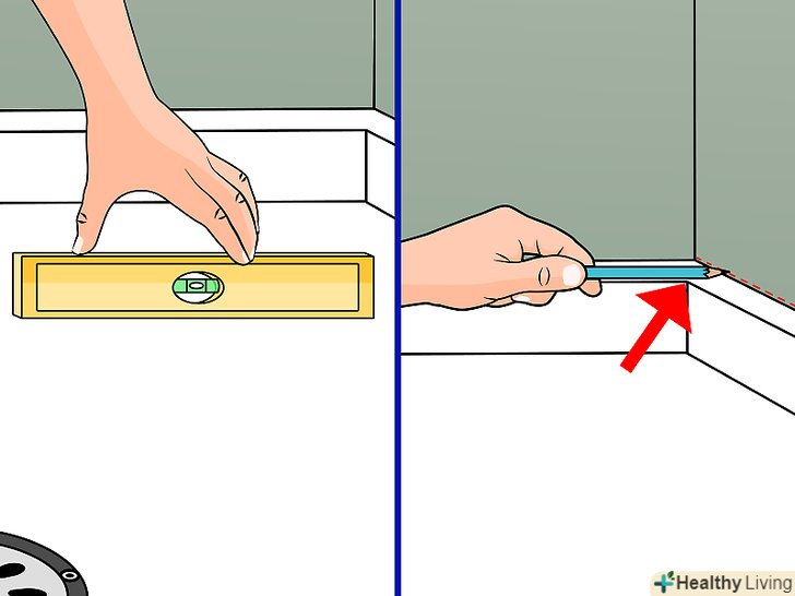 Вирівняйте піддон. переконайтеся, що піддон виставлений по відношенню до стін і інших елементів у вашій плануванні ванної кімнати. Якщо не виставити його правильно, то ваша кабінка може протікати, тому це особливо важливо. Використовуйте інструмент для вимірювання рівня і дерев'яні підкладки, якщо необхідно.- Не використовуйте велику кількість підкладок і не піднімайте піддон вище рівня панелей. Повинна знадобитися мінімальна кількість підкладок, якщо підстава для рівня-ваш підлогу. Як тільки піддон виставлений за рівнем, радимо відзначити верхній край піддону і розміщення підкладок, якщо вам пізніше знадобиться щось пересунути.