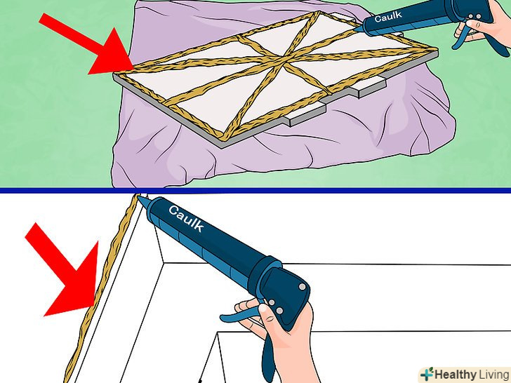 Використовуйте клей, щоб закріпити панелі. обережно розташуйте панель лицьовою стороною вниз на твердій і гладкій поверхні. Видавіть клей для ванни і душової на всю поверхню, яка буде стикатися зі стіною.- Якщо панель має велику поверхню, яка буде стикатися зі стіною, або, якщо панель цілком буде прилягати до стіни, намажте її клеєм у вигляді літери "X" від кута до кута з заднього боку панелі.