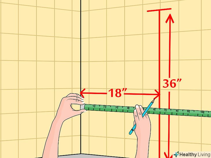 Зробіть вимірювання, щоб визначити положення труб. після покупки душової кабіни необхідного розміру, вам потрібно відзначити місце в піддоні, через яке буде проходити труба, щоб з'єднати всі необхідні елементи вашої кабіни незалежно від того, який тип кабіни ви придбали. Виміряйте відстань від підлоги та кута стіни, щоб отримати точні вимірювання.- Намалюйте схематичне зображення вашої стіни і сантехніки, і нанесіть на нього вимірювання. Наприклад: від кута стіни до центру Головного водопровідного крана близько 20 сантиметрів. Від підлоги до головного водопровідного крана - 50 сантиметрів. Виконайте ці дії для всіх елементів, які будуть проходити крізь панель. Обов'язково вкажіть ваші вимірювання на схемі.