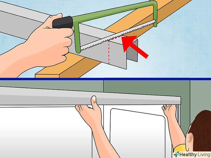 Виміряйте і обріжте верхню колію, якщо необхідно. переконайтеся, що колія щільно і правильно вирівняна між настінними коліями. Більшість комплектів можуть включати в себе куточки, які допомагають фіксувати верхню колію.- Деякі моделі поставляються з коліями різних розмірів, що означає, що вони можуть бути більшими, ніж вам потрібно, і ви можете обрізати їх до необхідного розміру. Якщо це так, використовуйте ножівку, а потім ретельно промийте їх.