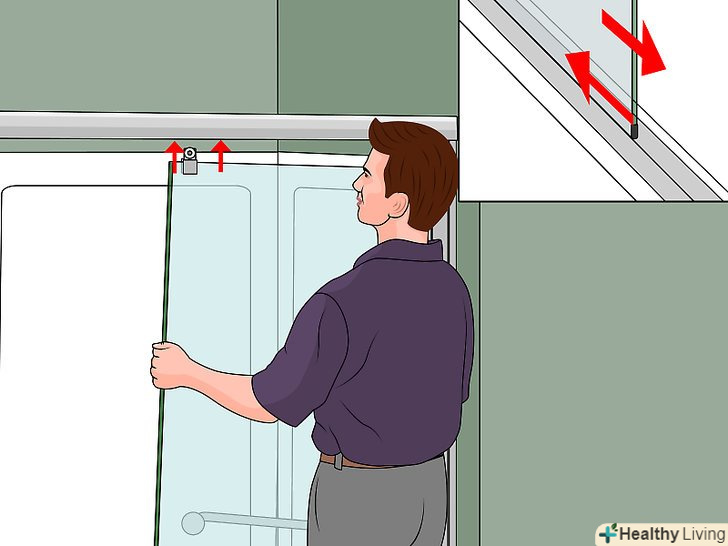 Для початку повісьте внутрішні розсувні двері. якщо ви встановлюєте розсувні двері, і обидві двері мають Вішалки для рушників, встановіть її стороною з роликами і вішалками всередину. Підніміть двері до верхньої колії і, потім, вставте її в верхню і нижню колії. Двері повинні з легкістю переміщатися, якщо встановлена правильно. Якщо ні, обережно спробуйте знову. В інструкції до вашої моделі має бути опис установки з докладними ілюстраціями.- Для деяких дверей, ролики повинні бути встановлені до того як ви почнете їх ставити на місце. Якщо це так, більшість будуть просто вставлятися на місце. Прочитайте інструкції.