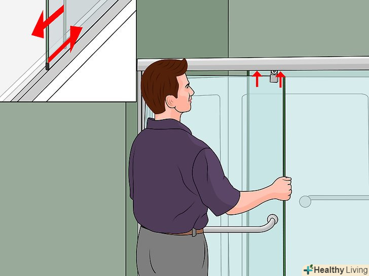 Повісьте зовнішні двері. Вішалка для рушників повинна бути назовні. Повісьте зовнішні двері таким же чином, як ви вішали внутрішню. Обережно виставте ролики і вставте в потрібні колії. Зовнішні двері повинні ковзати вільно поверх внутрішніх дверей, якщо встановлена правильно.