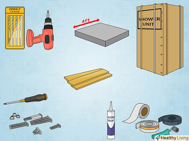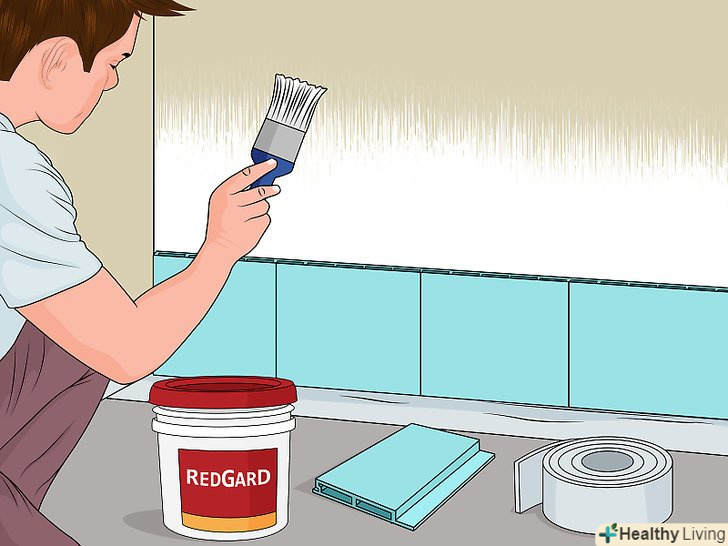 Зробіть стіни водонепроникними. встановіть водонепроникну дошку, яку буде накривати душова кабіна. Якщо це кутова кабіна, то має бути дві дошки, що формують кут. Водонепроникна дошка, найчастіше, виготовлена з волокна або цементної основи, частіше, сірого, зеленого або блакитного кольорів. Дошка може бути прикріплена до стіни за допомогою цвяхів або болтів.- Ніколи не встановлюйте душову кабіну на гіпсокартон, так як, через вологу, він розпадеться.