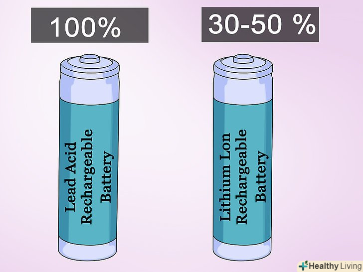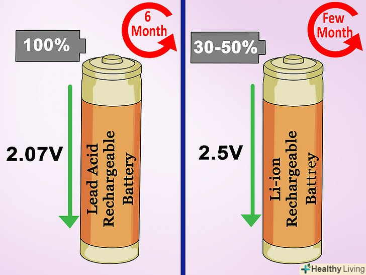 Періодично перезаряджайте свинцево-кислотні і літій-іонні акумуляторні батарейки. якщо зберігати свинцево-кислотні батарейки в майже розрядженому стані, в них можуть утворитися кристали (процес сульфатації), що знизить їх ємність. [14] недостатній заряд літій-іонних батарей може призвести до зміни структури мідних компонентів і короткого замикання, що небезпечно. [15] оптимальний заряд батарейок залежить від їх пристрою. Якщо у вас немає посібника з використання, дотримуйтеся наступних правил: