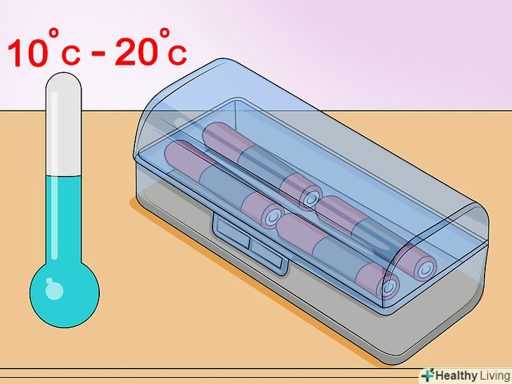 Зберігайте батарейки при кімнатній або більш низькій температурі. у більшості випадків підходить будь-яке прохолодне місце, в яке не проникають прямі сонячні промені. Навіть при порівняно високій температурі 25ºC звичайна батарейка за рік втрачає лише кілька відсотків свого заряду. Зберігання батарейок в холодильнику (або іншому місці при температурі 1-15ºC) ненабагато знижує втрати заряду, але в цьому немає необхідності, якщо тільки у вас немає іншої альтернативи або вам необхідна максимальна ефективність. У більшості випадків немає необхідності піддавати батарейки ризику і зберігати їх в холодильнику, так як там вони можуть намокнути. Крім того, перед використанням вийнятих з холодильника батарейок вам доведеться чекати, поки вони зігріються. [6] [7]- Не кладіть батарейку в холодильник, якщо тільки це не рекомендовано виробником. [8]