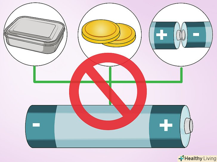 Оберігайте батарейки від контакту з провідниками. при контакті з металом через батарейки може протікати електричний струм. В цьому випадку вони швидко розряджаються і розігріваються. Щоб запобігти розрядці батарейок і зменшити ризик їх загоряння, вживіть таких заходів: [12] [13]- Не зберігайте батарейки в металевій тарі. Використовуйте щільно запечатувані пластикові коробки або спеціальні контейнери для зберігання батарейок.